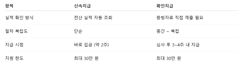 요약하자면, 신속지급은 자료 준비가 거의 없고 빠르다는 점이 장점이고, 확인지급은 조금 까다롭지만 실적만 있으면 누구나 가능하다는 점에서 접근성이 좋습니다. 중요한 건 자신이 어떤 유형인지 확인하는 것이고, 만약 전산 실적이 없다면 꼼꼼한 증빙 준비가 관건입니다.