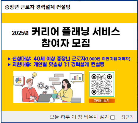직장 생활의 전환점을 맞이하고 계신가요? 40세 이상 근로자라면 누구나 노사발전재단의 커리어플래닝 서비스를 통해 새로운 도약을 준비할 수 있습니다. 지금 바로 신청하고, 당신의 미래를 위한 맞춤형 커리어 전략을 세워보세요!