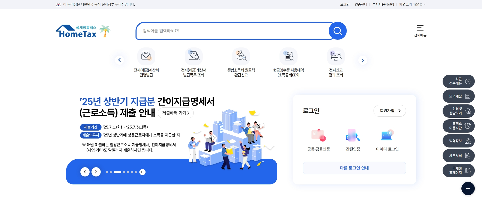 인터넷 검색창에 홈택스를 검색하여 국세청 홈택스 웹사이트에 접속합니다. 피싱 사이트 등 유사 사이트에 주의하고, 반드시 공식 홈페이지인지 확인해야 합니다.