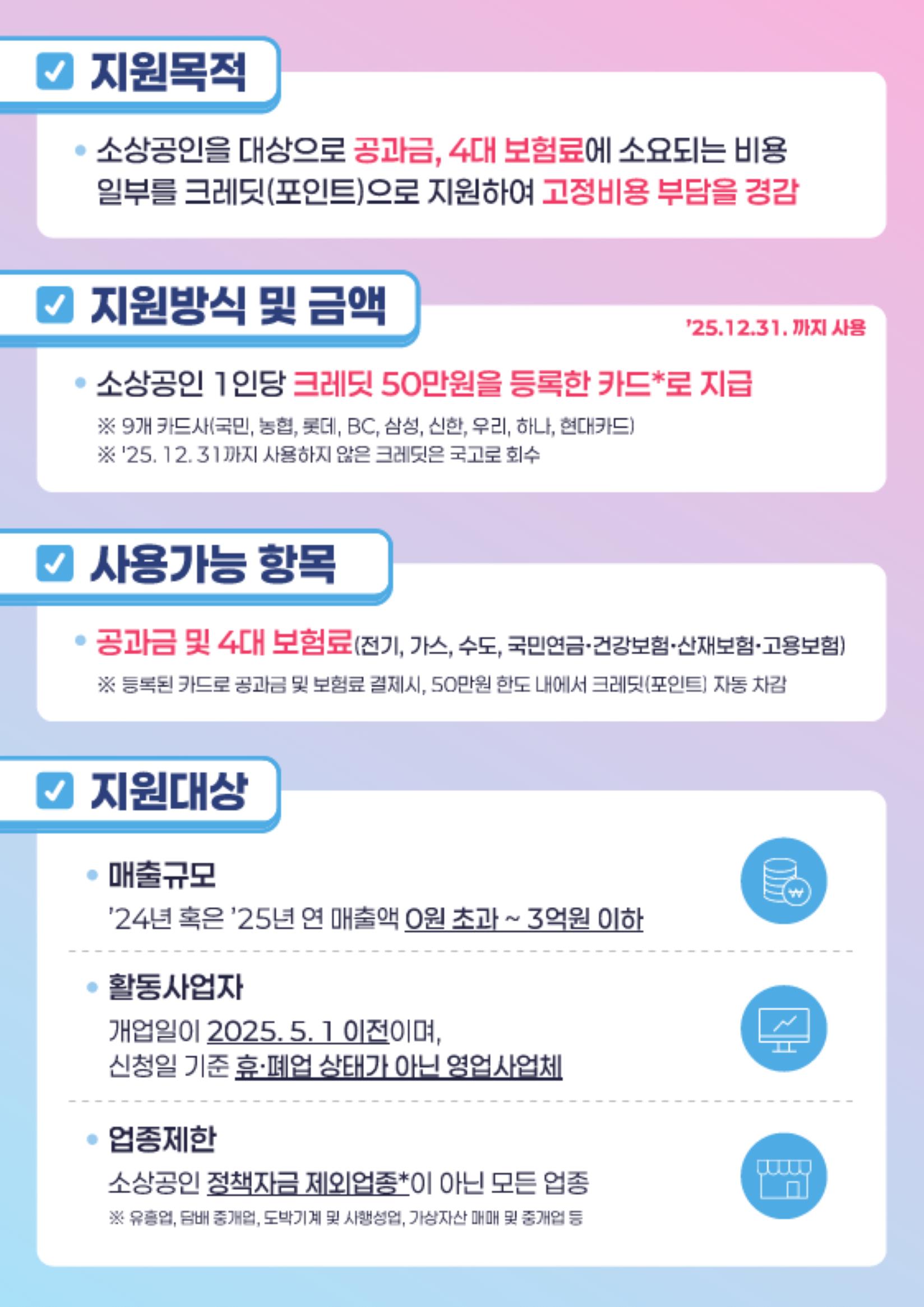 2025년 부담경감 크레딧은 단순히 일시적인 금전 지원을 넘어, 소상공인이 위기를 극복하고 재도약할 수 있는 소중한 기회입니다. 지원금을 현명하게 활용하고, 투명하게 관리함으로써 사업의 지속 가능한 성장을 도모하시기를 바랍니다.