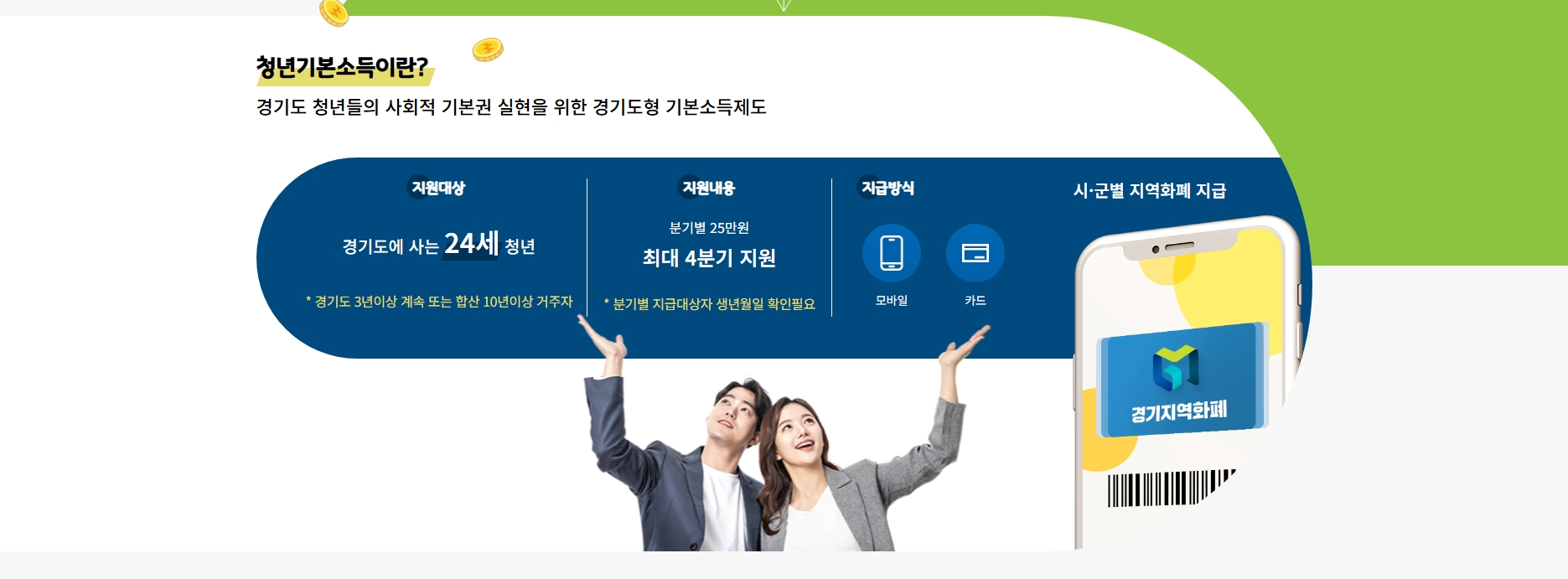 보편적 지급 : 소득이나 재산에 관계없이 만 24세 경기도 청년이라면 누구나 지급받을 수 있습니다.
