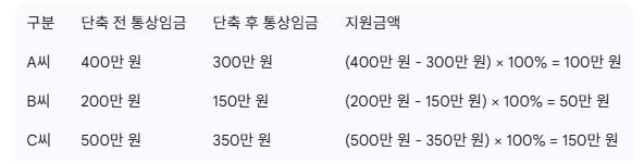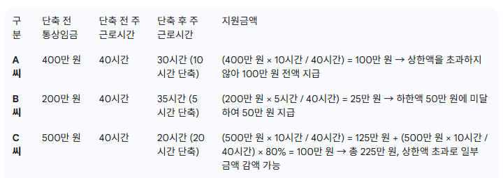 급여는 단축 전 월 통상임금을 기준으로 산정됩니다. 즉, 근무 시간을 줄여 임금이 감소하더라도, 일정 비율에 해당하는 금액을 고용보장에서 보전받게 됩니다.