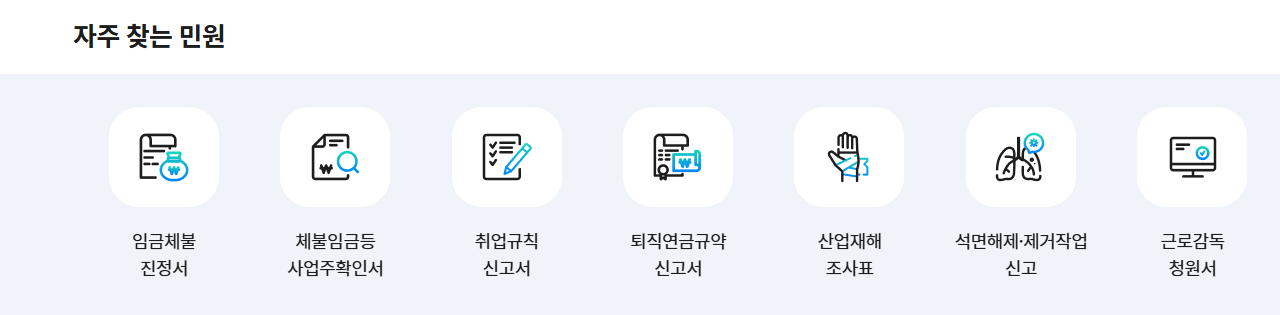 실업급여, 모성보호, 임금체불 등 여러 문제에 대해 노동포털을 통해 직접 민원을 제기할 수 있습니다. 각 민원 항목별로 어떤 내용을 신청할 수 있는지 더 자세히 알아볼까요?
