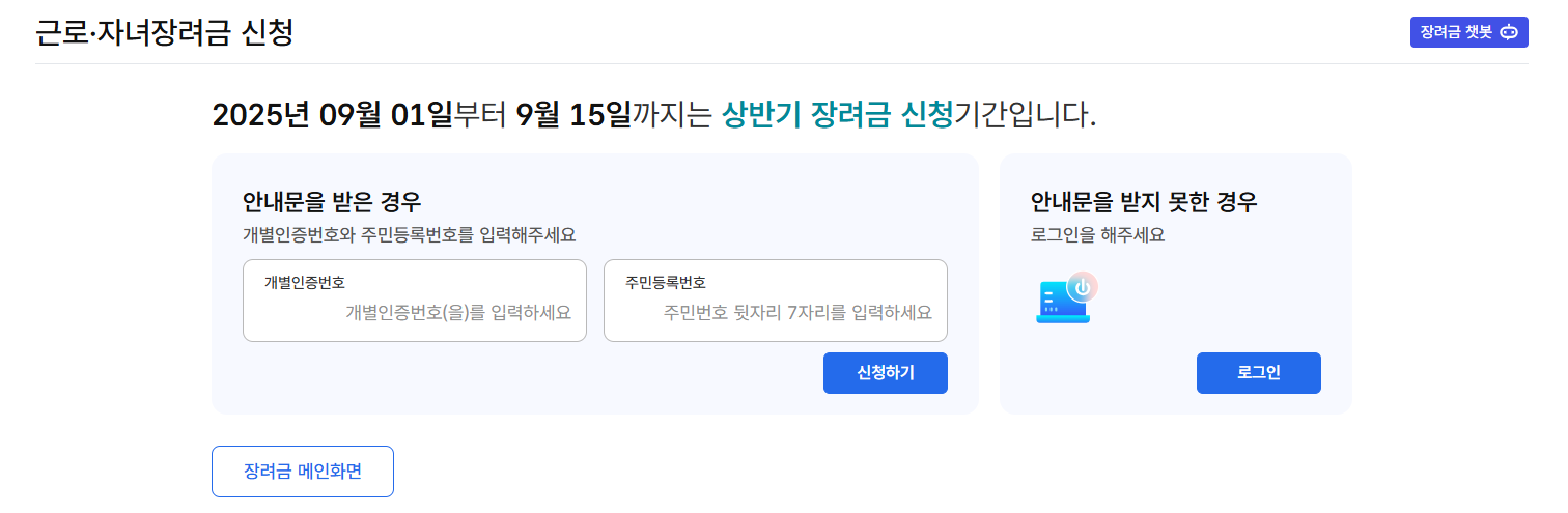 신청 대상 : 2025년 상반기(1월~6월)에 근로소득만 있는 가구