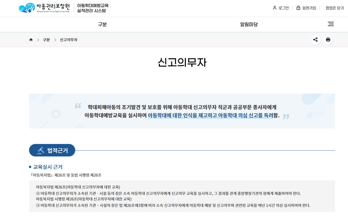 첫째, 아동학대 예방 및 신고의무에 관한 법령