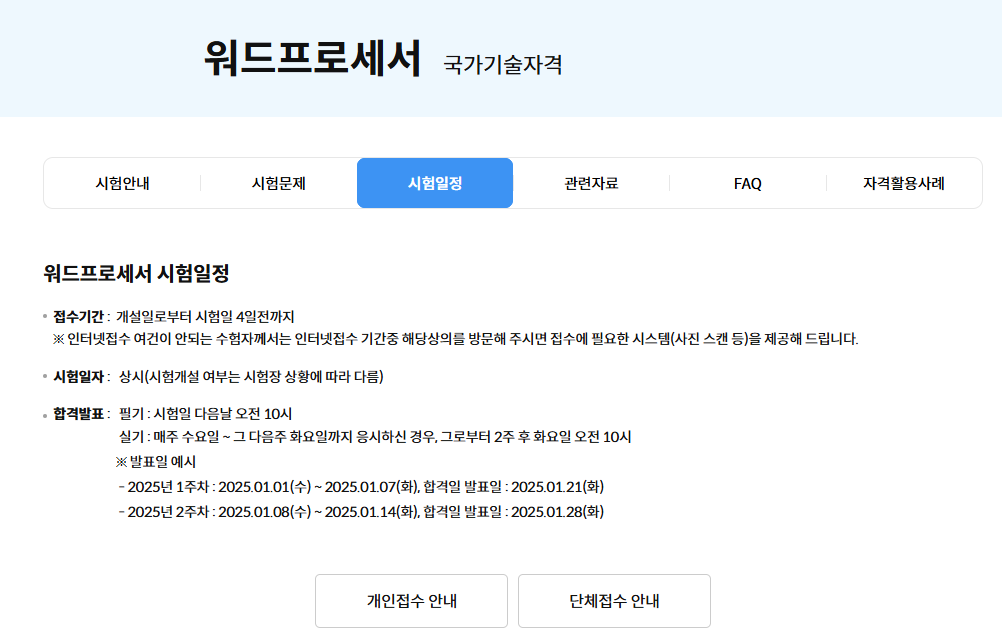 워드프로세서 시험은 상시로 진행되므로, 대한상공회의소 자격평가사업단 홈페이지에서 실시간으로 시험 일정을 확인할 수 있습니다.