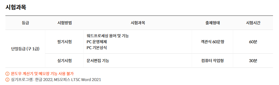 필기시험 : 워드프로세싱 용어 및 기능 / PC 운영체제 / PC 기본상식