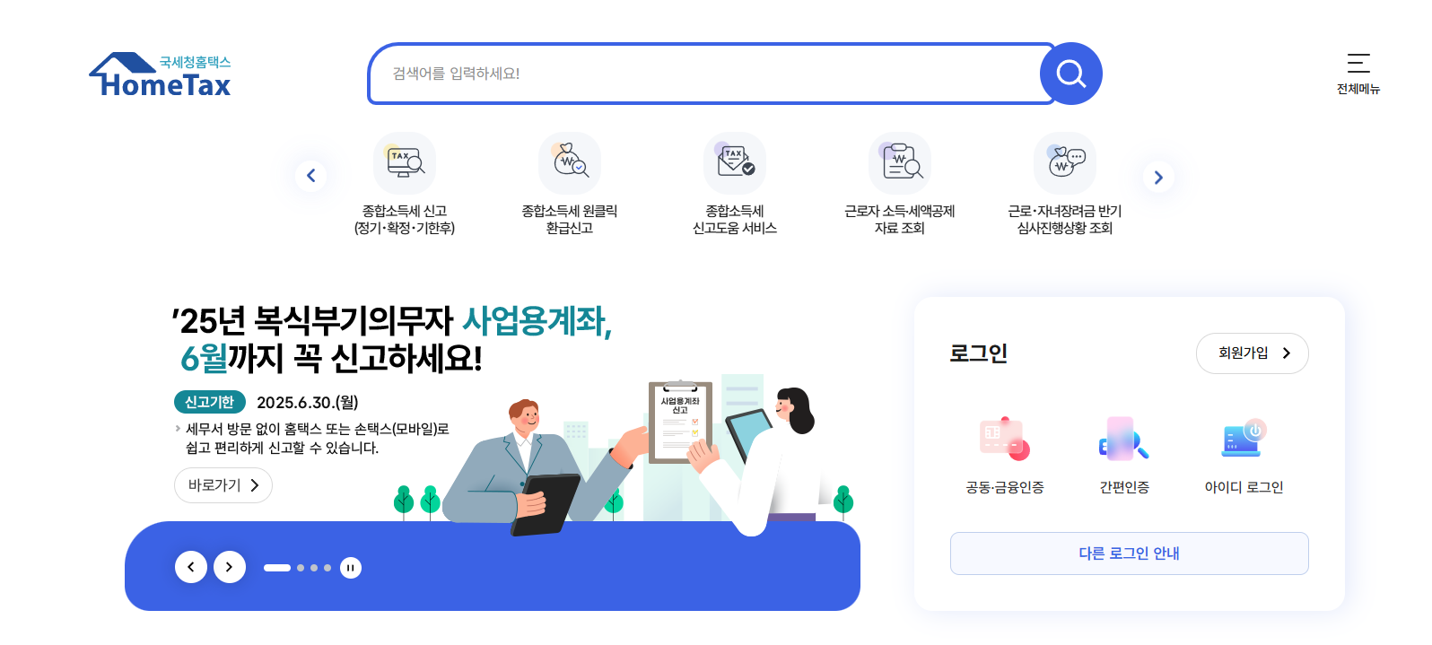 가입 준비가 모두 완료되었으면 홈택스 메인 페이지에서 신청 메뉴를 찾아 다음 단계로 넘어갈 수 있습니다. 회원가입만 해두었다면, 나머지 절차는 대부분 클릭 몇 번으로 해결됩니다.
