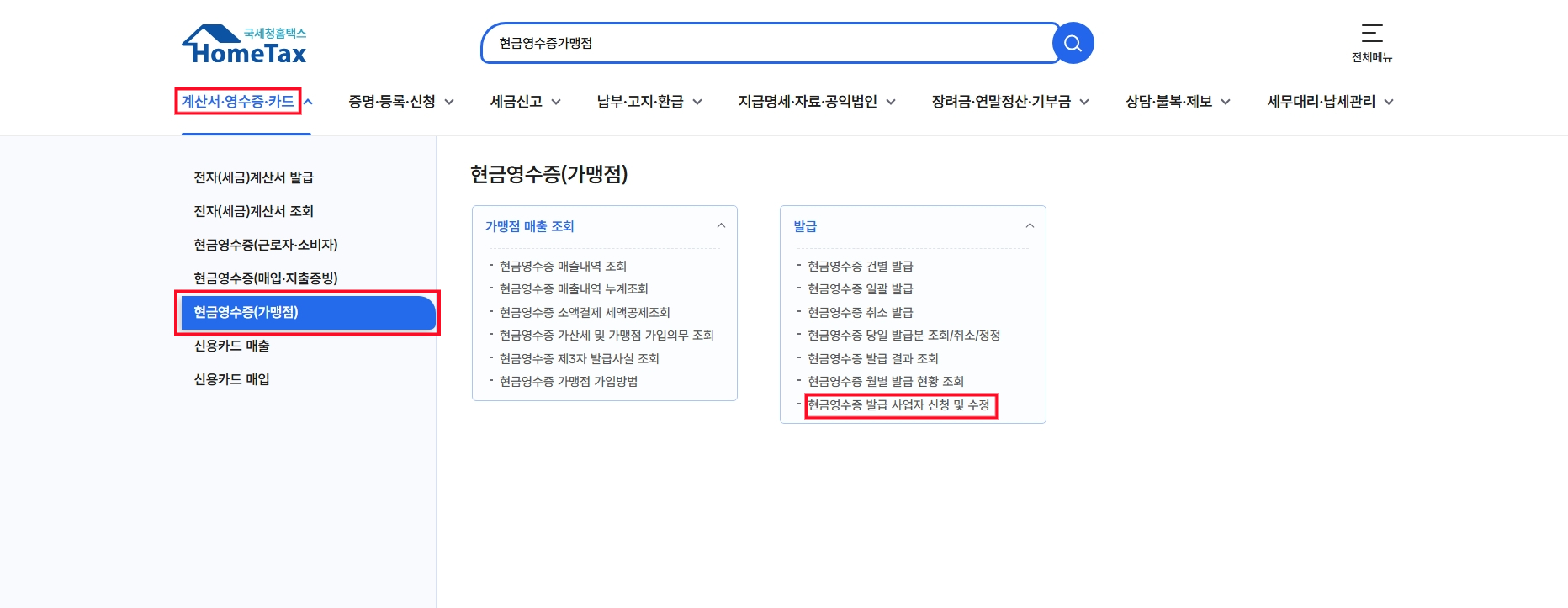 상단 메뉴에서 계산서·영수증·카드 카테고리를 클릭한 후 현금영수증 가맹점 신청 메뉴를 선택합니다.